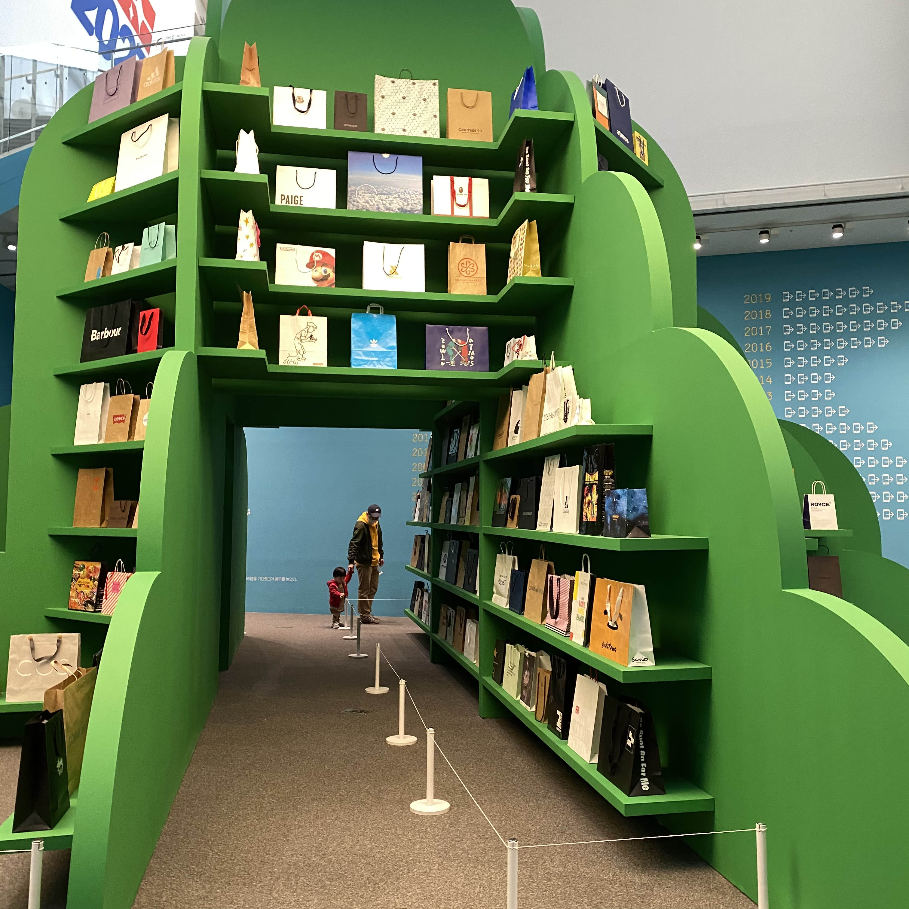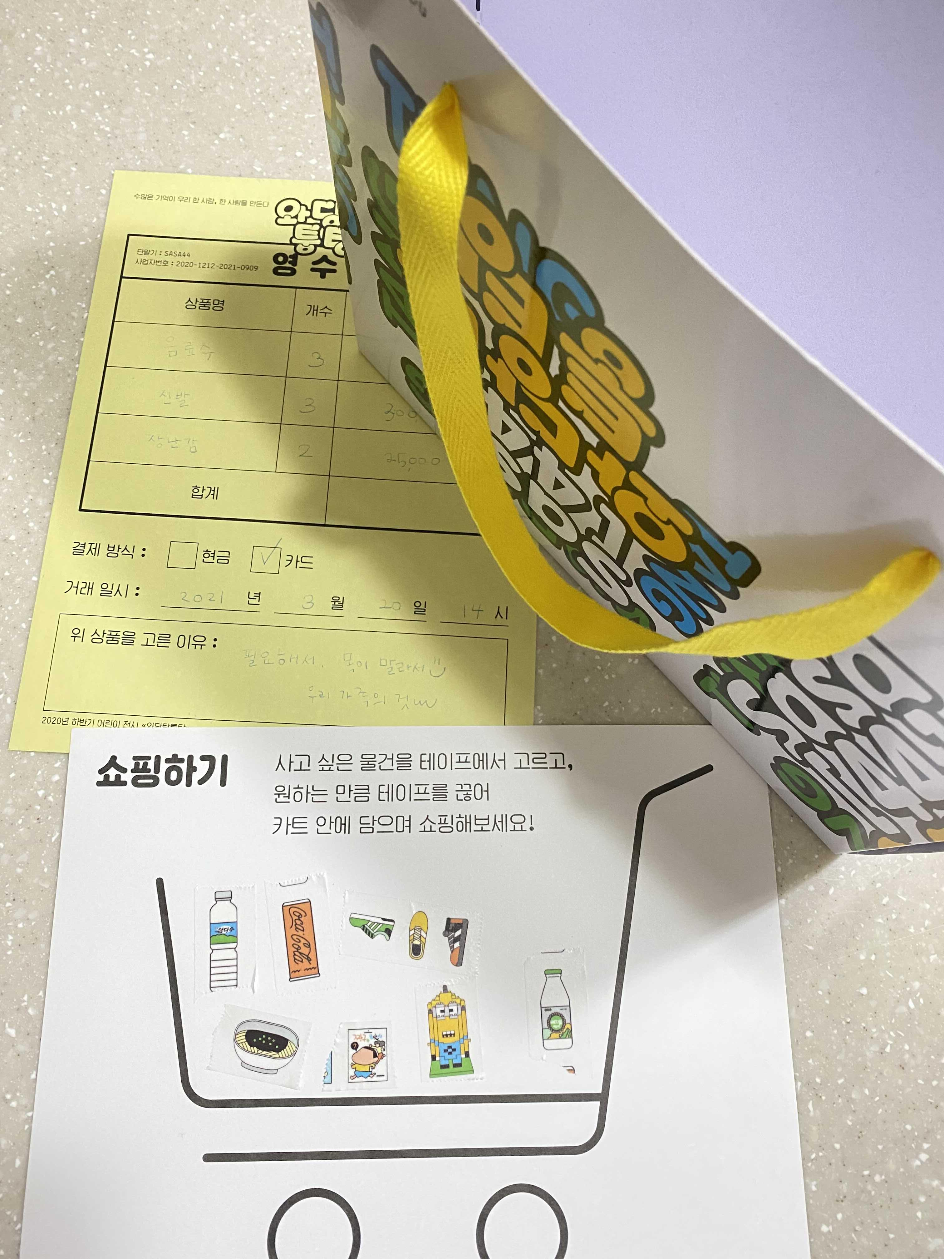 별도로 구분된 갤러리에서는 해당 전시와 관련된 활동을 체험할 수 있습니다. 전시회 로고로 꾸며진 쇼핑백을 만들고, 내가 쇼핑하고 싶은 물품을 스티커로 표현하여 쇼핑카트 종이에 붙이고, 영수증을 작성하여 직접 전시하는 활동입니다. 와이프만 해 볼 수 있었습니다. (아이와 저는 복도를 돌아다녔기 때문입니다.)